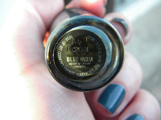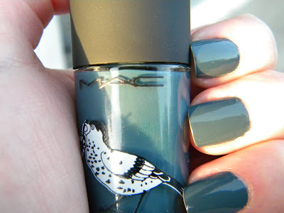 This is my first MAC polish. I was worried about the application because of all the things I have read on other blogs about MAC polishes being a streaky mess. After the first coat I was worried. I had massive bald spots and the color was unevenly dispersed. I added the second coat a little thicker than the first and it evened out perfectly. I LOVE THIS COLOR! It looks blue in some light, gray in others. I would call it a dusty teal blue. Tip wear is showing in these pictures and I have only had the polish on for about 24 hours, and I got a small chip last night before I went to bed so that sucked but the uniqueness of the color makes it worth it. I know I will be wearing this one again and again.